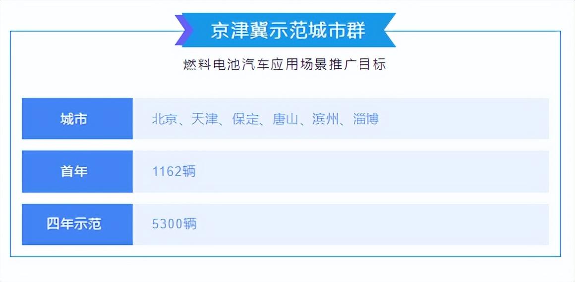 京津冀示范城市群燃料电池汽车应用场景区域包含北京、天津、河北保定、唐山、山东滨州及淄博共6个城市(区),四年示范期推广目标5300辆,首年推广目标为1162辆。